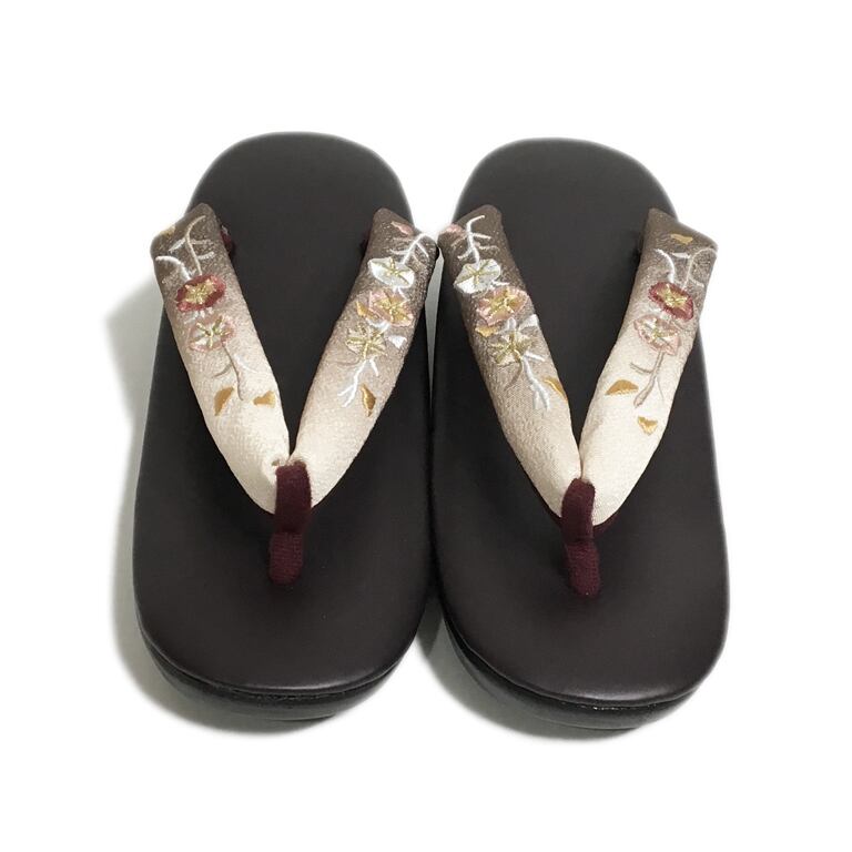 このウレタン草履は、ブラウンのグラデーションを施したシックなデザインが特徴です。スタイリッシュな黒字の本体に、花の刺繍がアクセントとして華やかな印象を与えています。どんな和装にも合わせやすく、エレガンスを演出するアイテムとなっています。